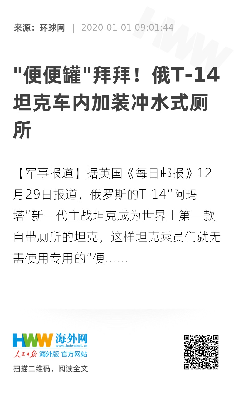 【环球网军事报道】据英国《每日邮报》12月29日报道,俄罗斯的T-14“阿玛塔”新一代主战坦克成为世界上第一款自带厕所的坦克,这样坦克乘员们就无需使用专用的“便便罐”解决问题了。