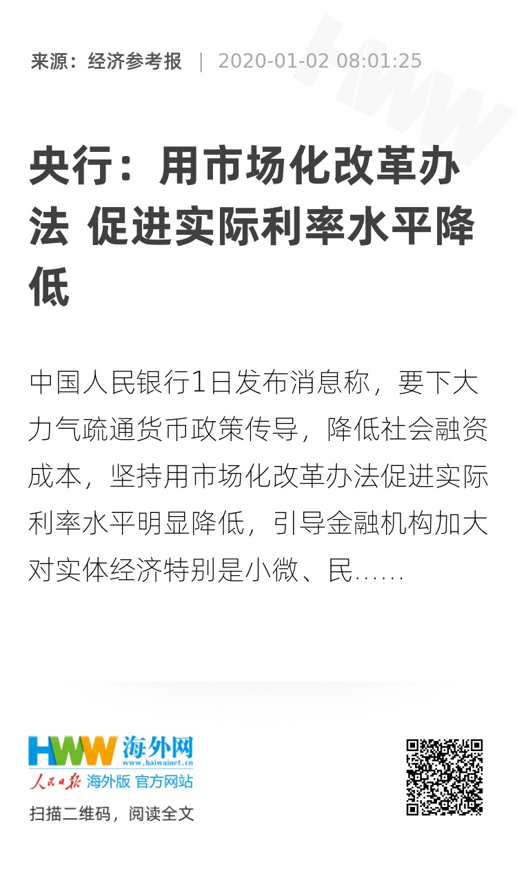 中国人民银行1日发布消息称,要下大力气疏通货币政策传导,降低社会融资成本,坚持用市场化改革办法促进实际利率水平明显降低,引导金融机构加大对实体经济特别是小微、民营企业的支持力度。