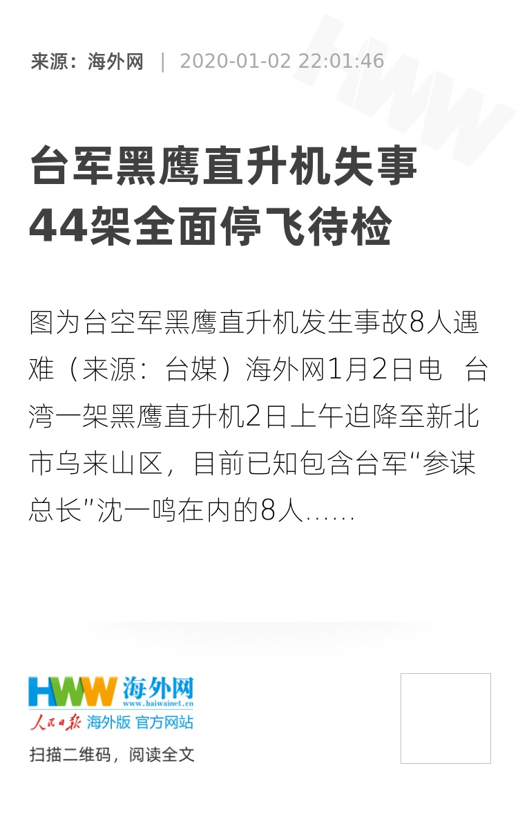 另外,台“空勤总队”一架UH-60M黑鹰直升机在2018年2月5日执行病患后送任务时失事,在兰屿外海坠毁,造成机上6人全数罹难。