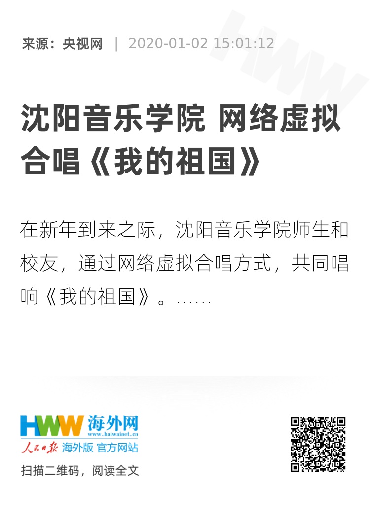 在新年到来之际,沈阳音乐学院师生和校友,通过网络虚拟合唱方式,共同唱响《我的祖国》。