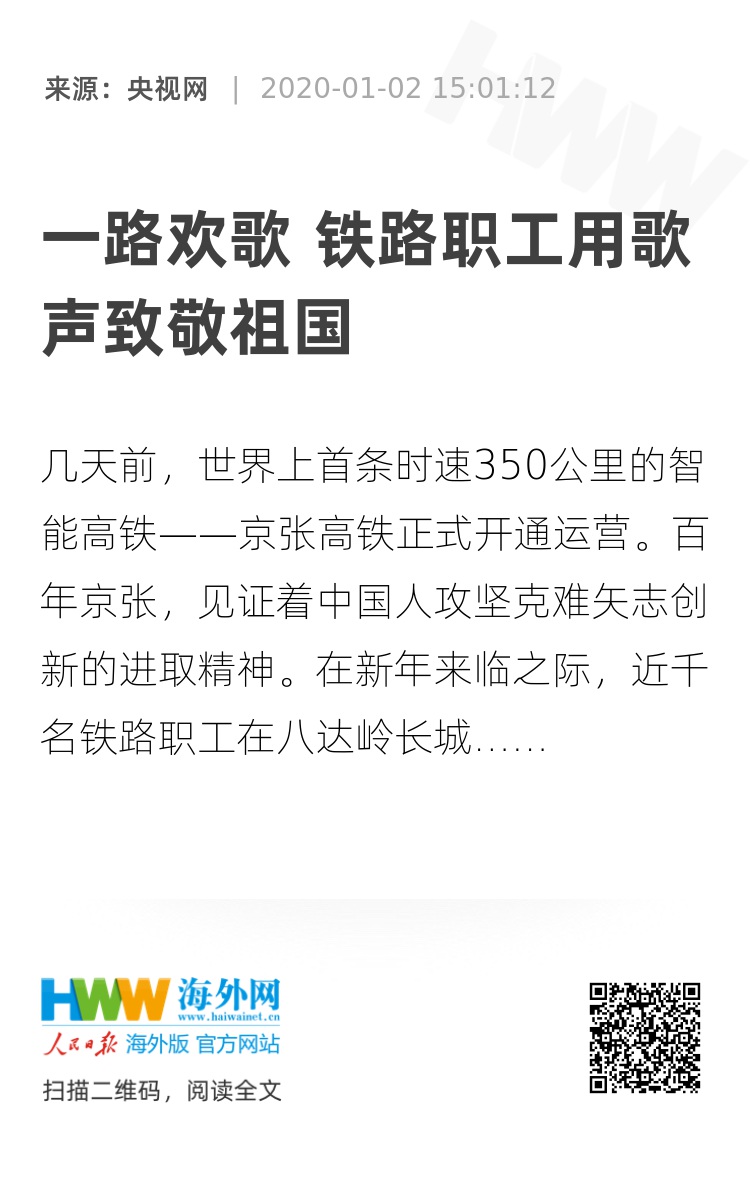 几天前,世界上首条时速350公里的智能高铁——京张高铁正式开通运营。百年京张,见证着中国人攻坚克难矢志创新的进取精神。在新年来临之际,近千名铁路职工在八达岭长城站、京雄城际铁路建设工地、中欧班列途径车站,共同唱响《我的祖国》,致敬伟大祖国。