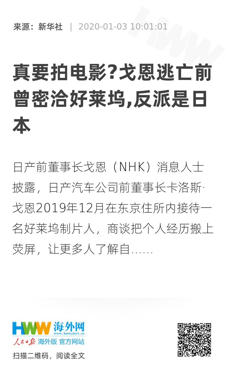 美国《纽约时报》2日报道,暂时不清楚这次会面的具体时间,但戈恩当时似乎正筹划逃离日本。进入2020年,戈恩身在黎巴嫩的消息经全球媒体报道,已经具备好莱坞大片的所有要素:犯罪嫌疑人搭乘私人飞机逃亡、多国护照、关联逃离计划幕后团队的传闻、助推阴谋论的相关国家和人士否认声明。