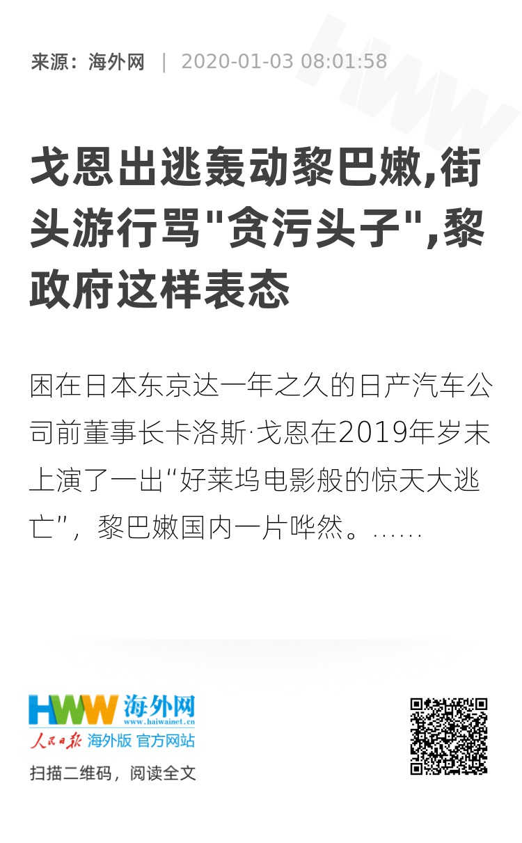 日本时事通信社也指出,日本和黎巴嫩间确实没有缔结过引渡协议,今后追究戈恩的刑事责任“十分困难”。(海外网 王珊宁)