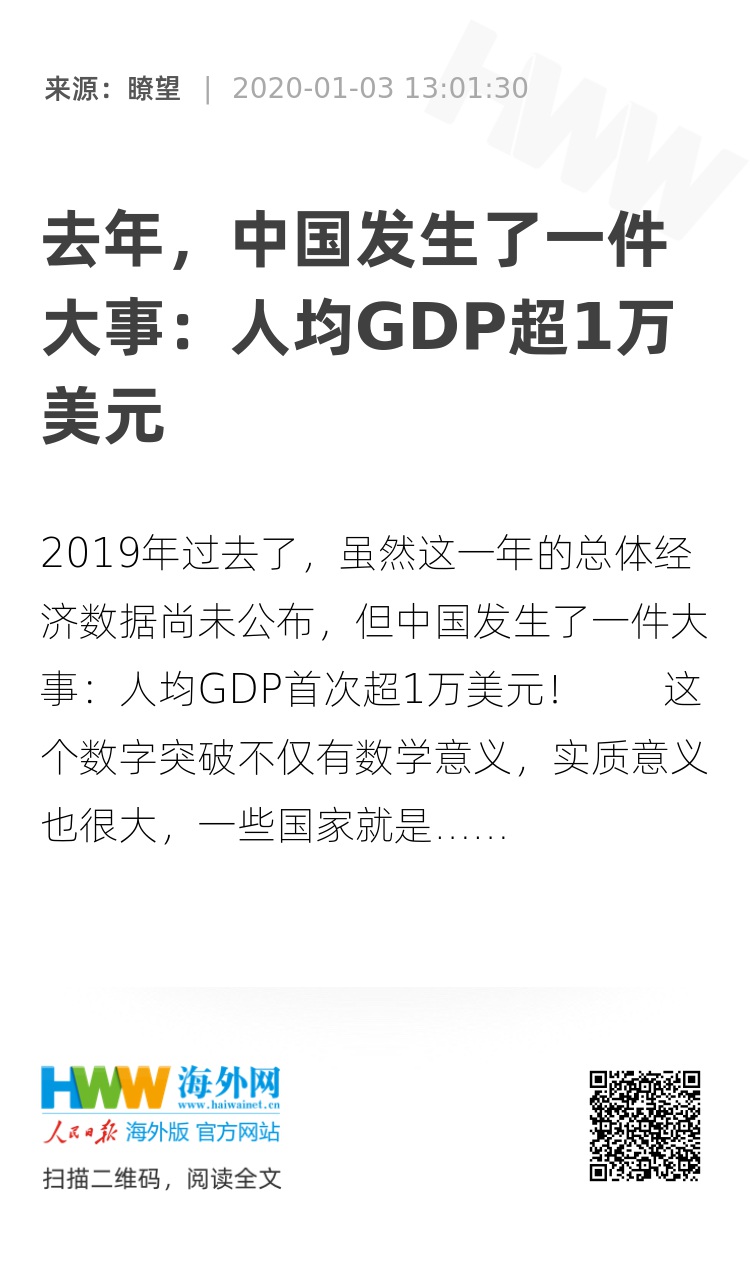2019年过去了,虽然这一年的总体经济数据尚未公布,但中国发生了一件大事:人均GDP首次超1万美元!