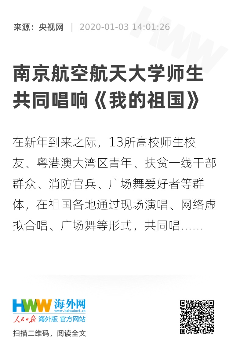 在新年到来之际,13所高校师生校友、粤港澳大湾区青年、扶贫一线干部群众、消防官兵、广场舞爱好者等群体,在祖国各地通过现场演唱、网络虚拟合唱、广场舞等形式,共同唱响《我的祖国》,用质朴的歌声表达对祖国的爱。
