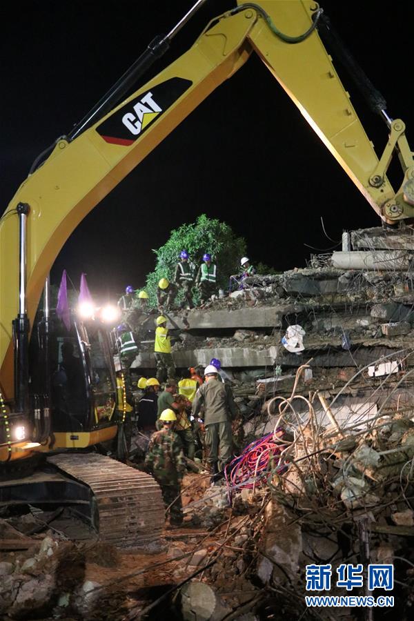 1月4日,在柬埔寨白马市,救援人员在楼房坍塌事故现场工作。新华社记者毛鹏飞摄