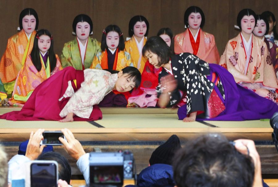当地时间2020年1月3日,日本京都东山区,八坂神社举办“新年和歌纸牌”大赛,12名女性选手身着传统服饰参加。