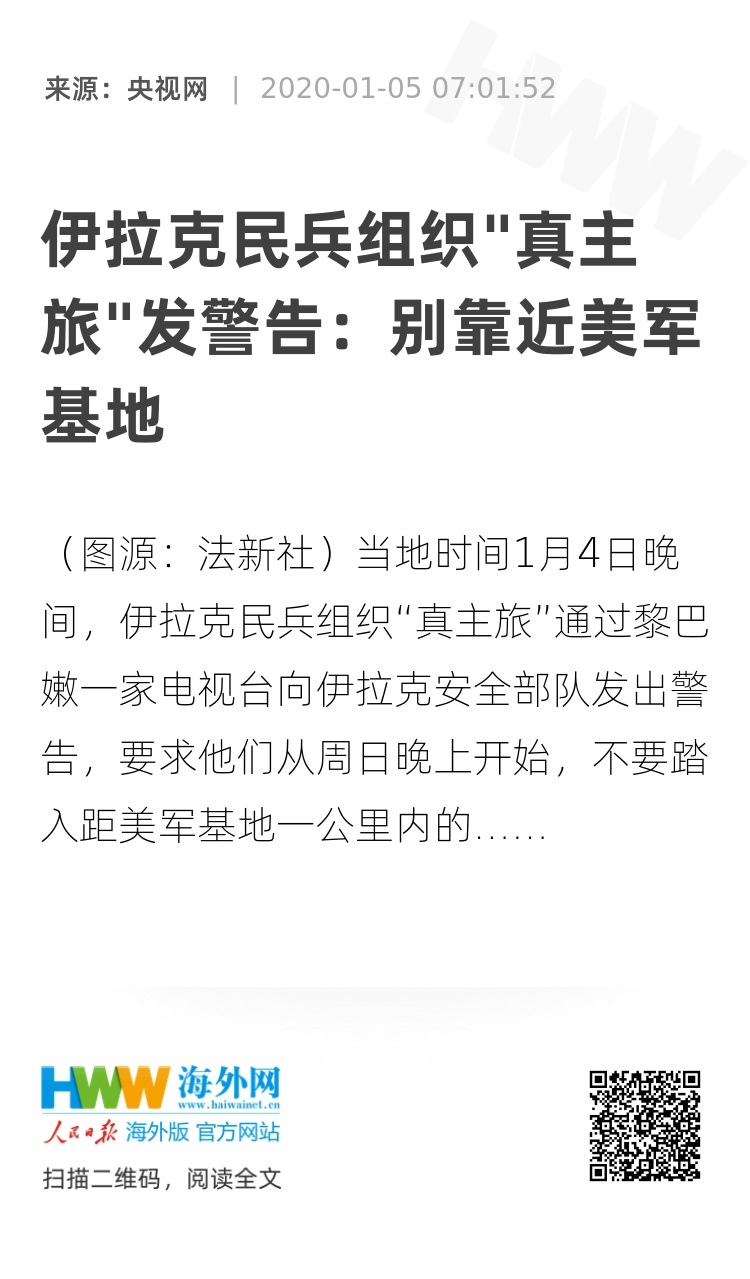 当地时间1月4日晚间,伊拉克民兵组织“真主旅”通过黎巴嫩一家电视台向伊拉克安全部队发出警告,要求他们从周日晚上开始,不要踏入距美军基地一公里内的范围。“真主旅”在伊拉克边境城市加伊姆的部队在12月29日遭到美军空袭,造成25人死亡,51人受伤。1月3日凌晨,“真主旅”原领导人穆汉迪斯也在美军空袭中身亡。(央视记者 付新日)