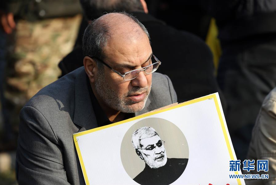 1月4日,在伊拉克巴格达,哀悼者举着伊拉克什叶派民兵武装“人民动员组织”副指挥官阿布·迈赫迪·穆汉迪斯的画像参加送葬活动。新华社发(哈利勒·达伍德摄)