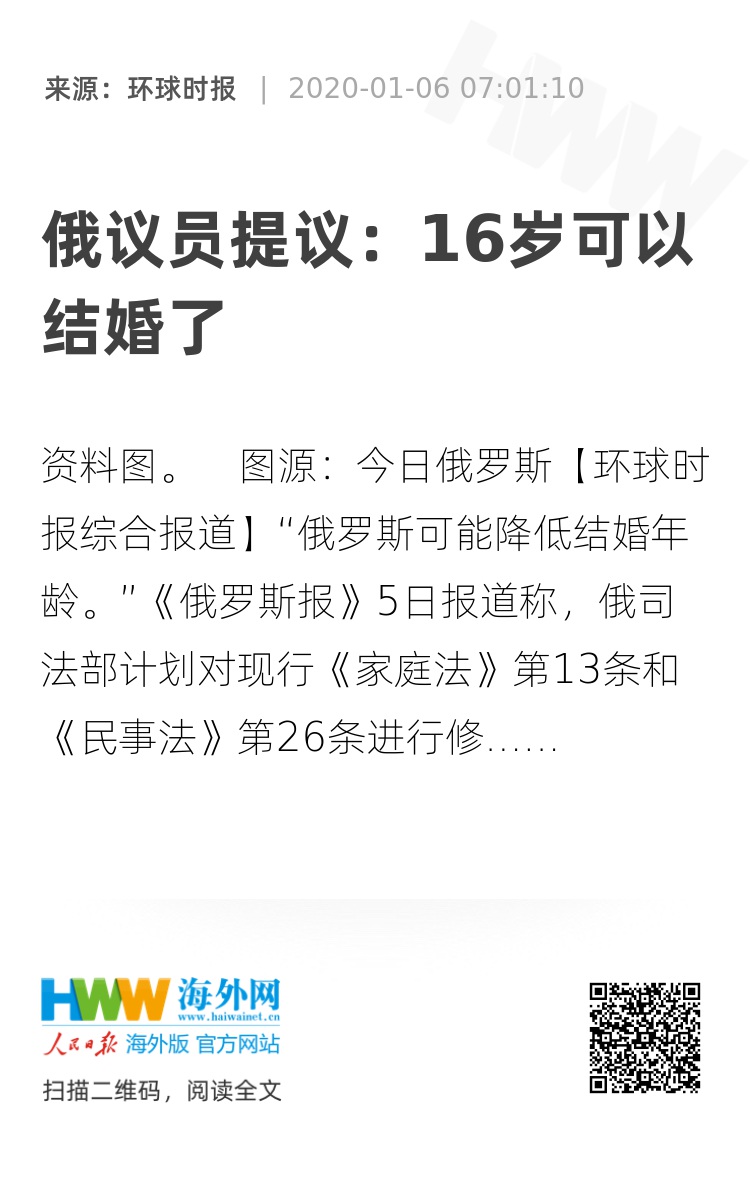 【环球时报综合报道】“俄罗斯可能降低结婚年龄。”《俄罗斯报》5日报道称,俄司法部计划对现行《家庭法》第13条和《民事法》第26条进行修改,即调整结婚年龄和明确允许18岁以下未成年人结婚的理由。虽然“调整”年龄意味着提高或降低法定结婚年龄,但俄专家认为,司法部此举意在降低结婚年龄。俄罗斯社会各界对此持不同的看法。