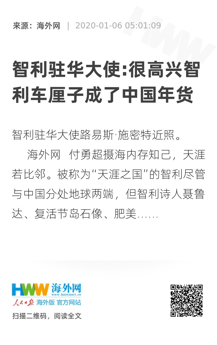 日前,智利驻华大使路易斯·施密特接受了人民日报海外网专访。在采访中,先后两次担任驻华大使的施密特表达了对中国的喜爱之情。2020年恰逢中国与智利建交50周年,施密特希望以此为契机不断深化智中两国的经贸往来和人文交流。