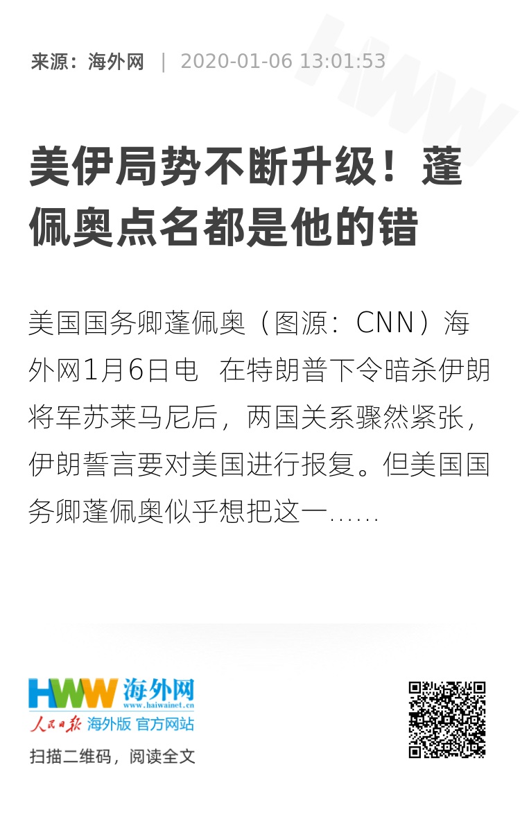 此外,蓬佩奥还“自信”表示苏莱马尼之死让美国和世界变得更加安全,当天美国全国广播公司(NBC)的记者提问“所以美国公民会受到报复,对吗?”,对此,蓬佩奥答道:“我们今天绝对更加安全,可以100%肯定美国今天更安全了。”