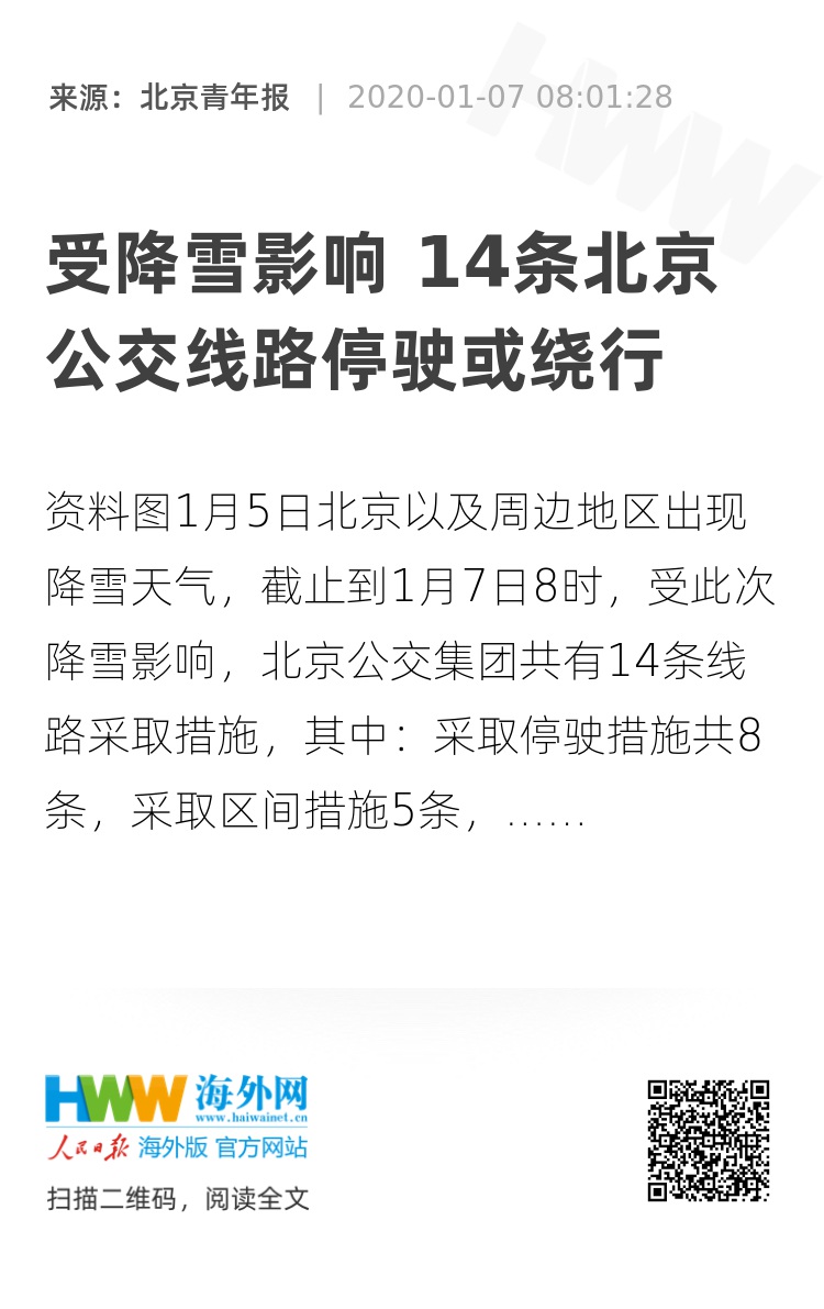 1月5日北京以及周边地区出现降雪天气,截止到1月7日8时,受此次降雪影响,北京公交集团共有14条线路采取措施,其中:采取停驶措施共8条,采取区间措施5条,采取绕行甩站措施1条。具体措施如下: