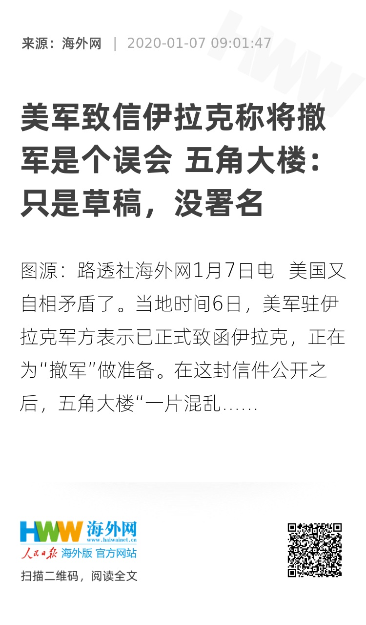 海外网1月7日电 美国又自相矛盾了。当地时间6日,美军驻伊拉克军方表示已正式致函伊拉克,正在为“撤军”做准备。在这封信件公开之后,五角大楼“一片混乱”。美军最高将领立即解释这是个“错误”,美国防长辩称“美国没有撤军计划”。