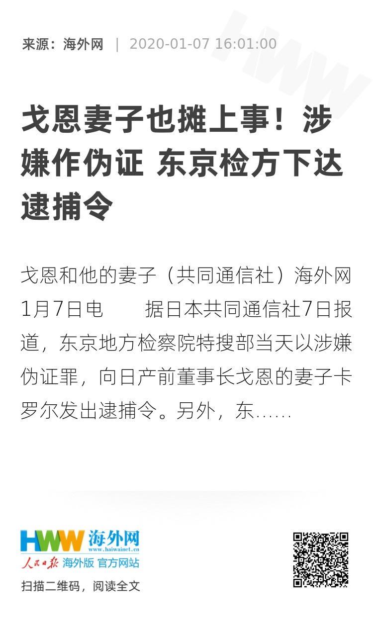 报道称,2019年4月,卡罗尔作为证人在东京地方法院就戈恩渎职案提供证言,但特搜部怀疑她提供的是虚假证言。