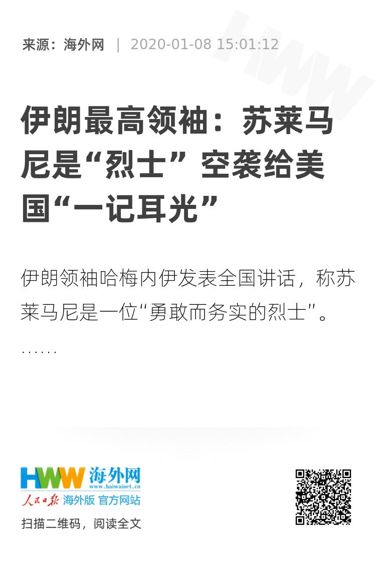海外网1月8日电 当地时间8日,伊朗最高领袖哈梅内伊向全国发表讲话。他在讲话中对在美军袭击中丧生的伊朗将军苏莱马尼表示怀念,并称他为“勇敢而务实的烈士”。
