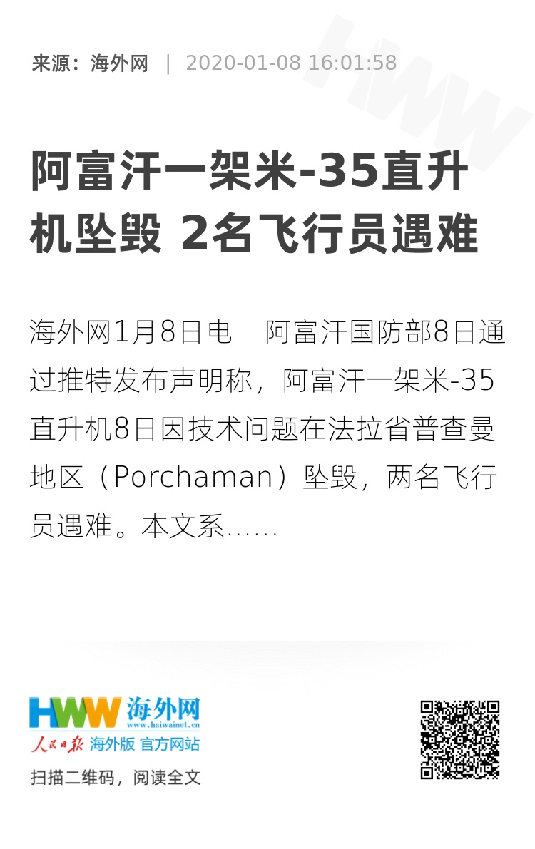 海外网1月8日电 阿富汗国防部8日通过推特发布声明称,阿富汗一架米-35直升机8日因技术问题在法拉省普查曼地区(Porchaman)坠毁,两名飞行员遇难。