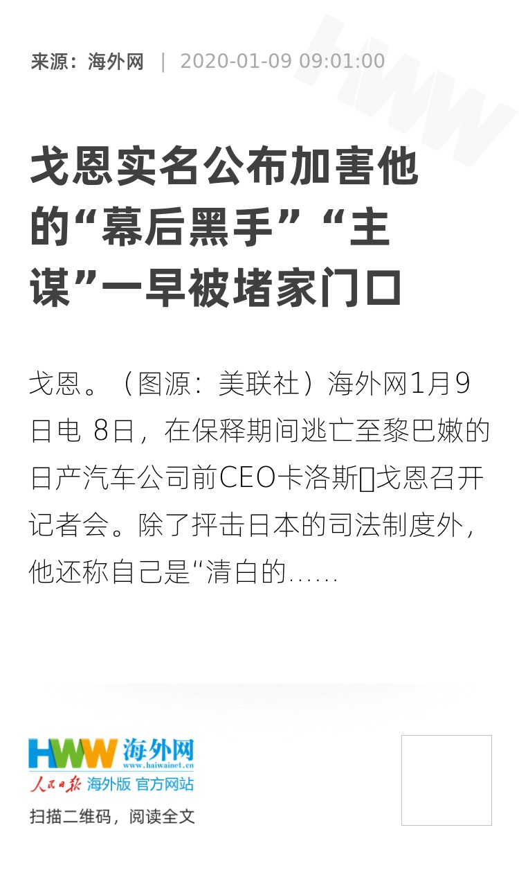 海外网1月9日电 8日,在保释期间逃亡至黎巴嫩的日产汽车公司前CEO卡洛斯・戈恩召开记者会。除了抨击日本的司法制度外,他还称自己是“清白的”,并披露了导致其被捕的几位“幕后黑手:
