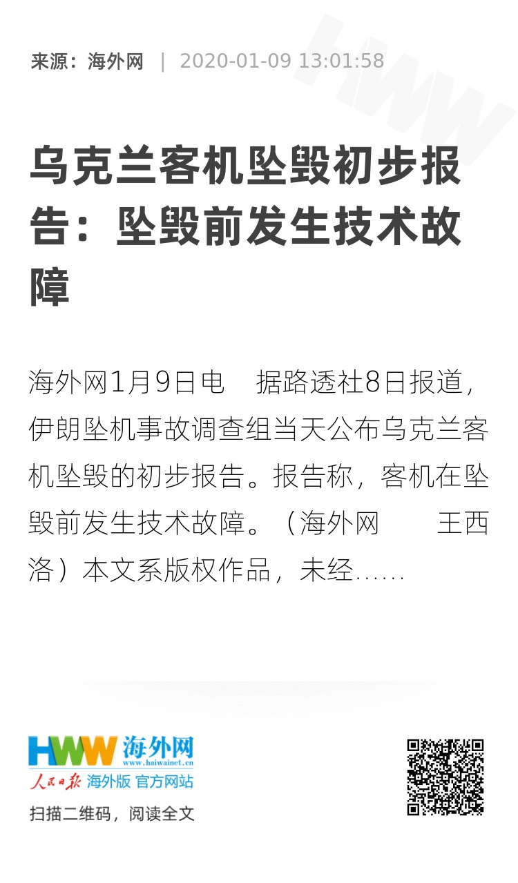 海外网1月9日电 据路透社8日报道,伊朗坠机事故调查组当天公布乌克兰客机坠毁的初步报告。报告称,客机在坠毁前发生技术故障。(海外网 王西洛)