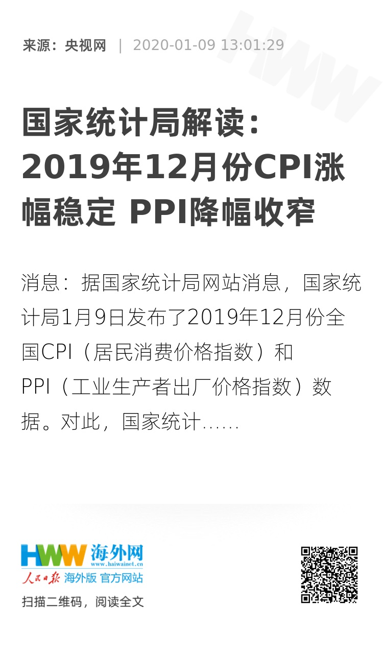 央视网消息:据国家统计局网站消息,国家统计局1月9日发布了2019年12月份全国CPI(居民消费价格指数)和PPI(工业生产者出厂价格指数)数据。对此,国家统计局城市司高级统计师沈赟进行了解读。