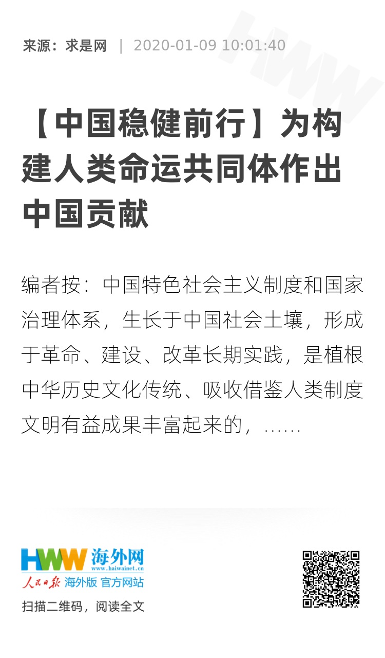 面对世界“百年未有之大变局”,稳健前行的中国秉持共商共建共享的全球治理观,高举和平、发展、合作、共赢的旗帜,积极为推动构建人类命运共同体作出中国贡献。