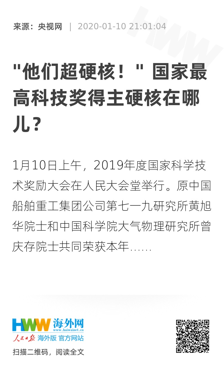 1月10日上午,2019年度国家科学技术奖励大会在人民大会堂举行。原中国船舶重工集团公司第七一九研究所黄旭华院士和中国科学院大气物理研究所曾庆存院士共同荣获本年度国家最高科学技术奖。“他们超硬核!”有媒体如此评价两位国家最高科技奖得主。两位科学家在各自领域作出了划时代的贡献,科研成就足以彪炳史册,的确是硬核。除了这个硬核,还有一种硬核同样让人感佩——爱国。