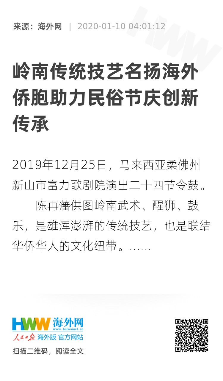 最重要的,还是华侨华人凝心聚力,对岭南文化传承给予更多重视。尹雷说,在马来西亚,很多华人都会开创武馆。武馆师傅在这里是备受尊重的职业。尹雷说:“我想开个自己的武馆,把岭南文化中的醒狮和拳术结合起来,带给更多人。”