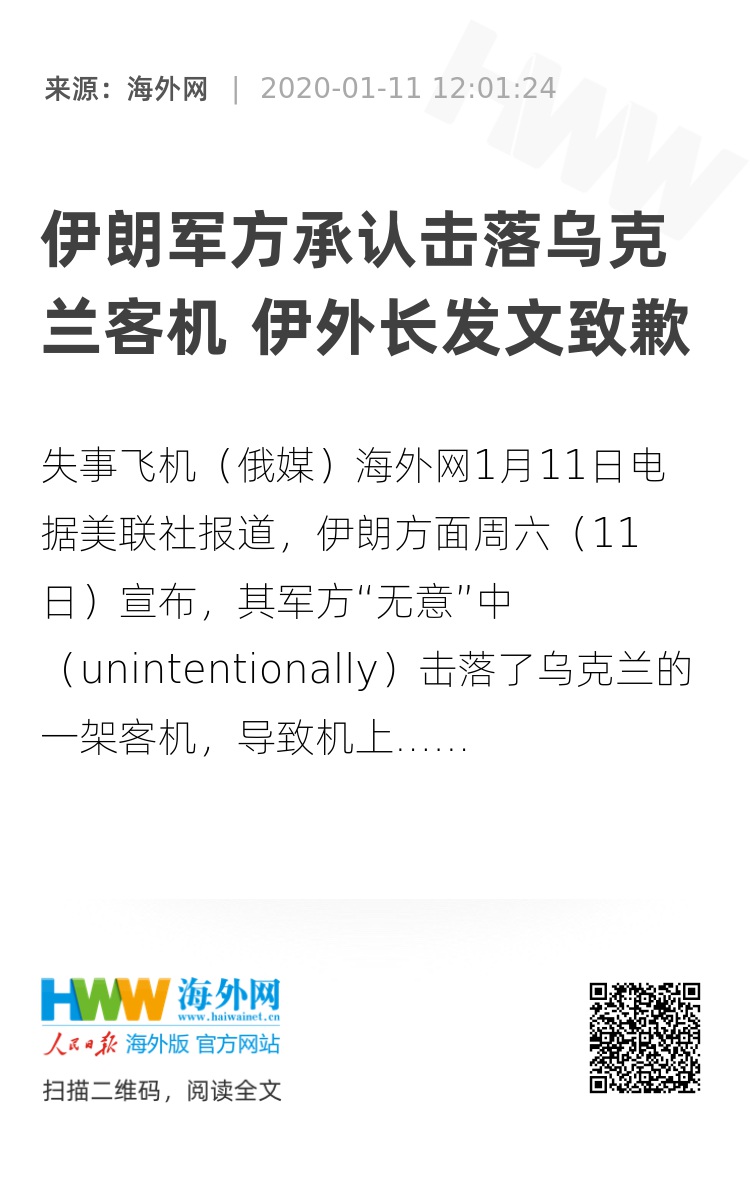 海外网1月11日电 据美联社报道,伊朗方面周六(11日)宣布,其军方“无意”中(unintentionally)击落了乌克兰的一架客机,导致机上176人全部遇难。声明称 ,这次意外是由于“人为错误”导致的。伊朗外长扎里夫随后在社交媒体上发文致歉。