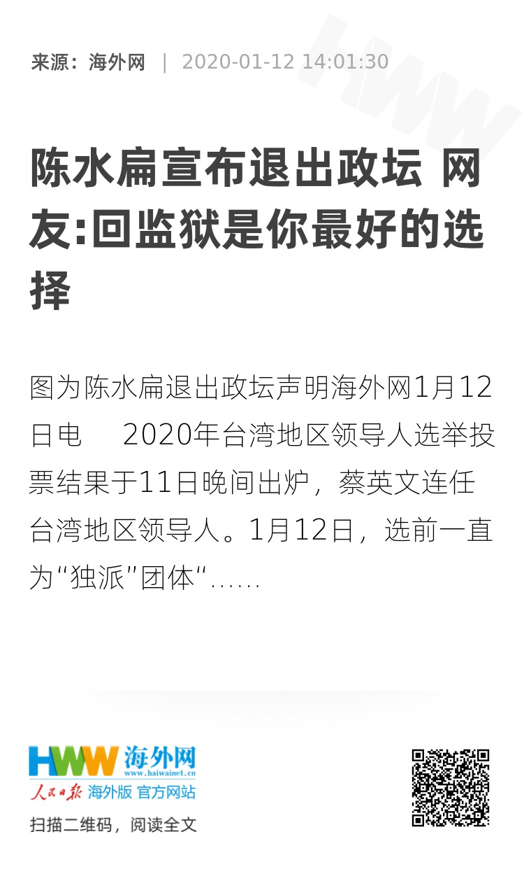 海外网1月12日电 2020年台湾地区领导人选举投票结果于11日晚间出炉,蔡英文连任台湾地区领导人。1月12日,选前一直为“独派”团体“一边一国行动党”拉票的前台湾地区领导人陈水扁发布声明“宣布从此退出政坛”。岛内网友嘲讽:“回中监(台中监狱)休息,这是你最好的选择。”