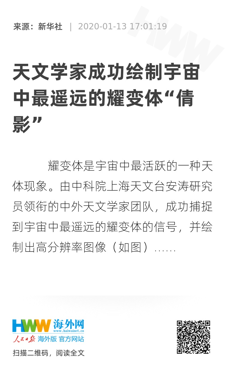 耀变体是宇宙中最活跃的一种天体现象。由中科院上海天文台安涛研究员领衔的中外天文学家团队,成功捕捉到宇宙中最遥远的耀变体的信号,并绘制出高分辨率图像(如图)。国际权威期刊《自然-通讯》1月9日在线发表了相关研究论文。 新华社发 图片来源:新华网