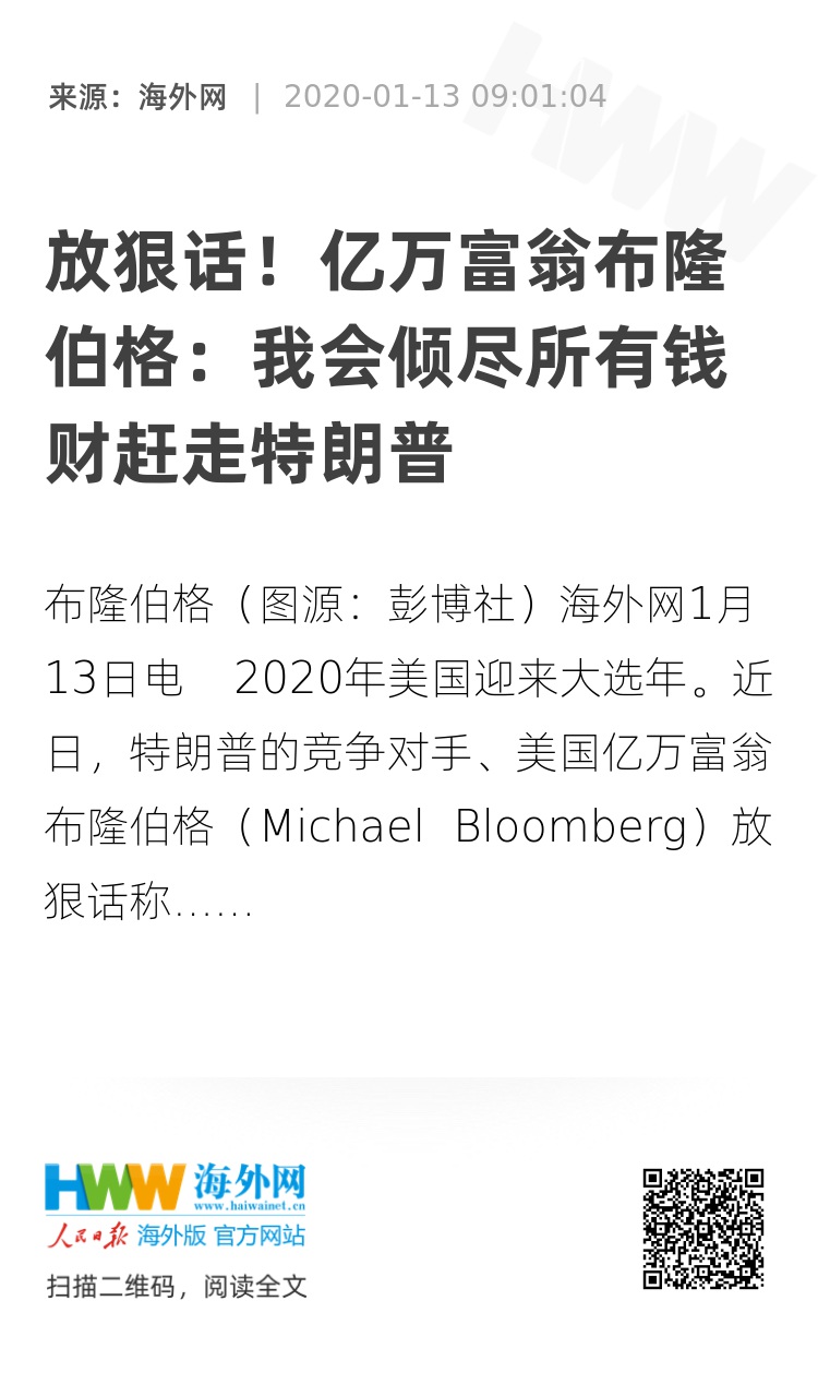 海外网1月13日电 2020年美国迎来大选年。近日,特朗普的竞争对手、美国亿万富翁布隆伯格(Michael Bloomberg)放狠话称,花光所有钱也要赶走特朗普。