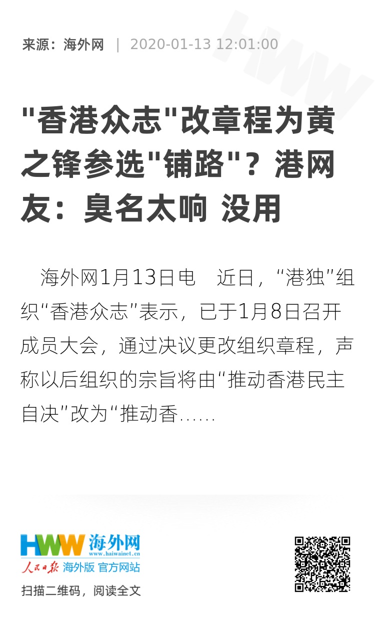 海外网1月13日电 近日,“港独”组织“香港众志”表示,已于1月8日召开成员大会,通过决议更改组织章程,声称以后组织的宗旨将由“推动香港民主自决”改为“推动香港的民主与进步价值”,“香港众志”此举被港媒指“在为黄之锋等人参选立法会铺路”。对此,香港网友纷纷表示,臭名太响了,怎么改都没用!