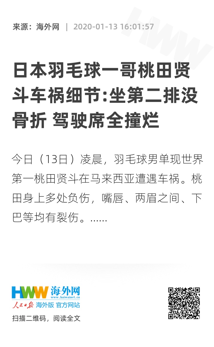 日本羽毛球协会称,车祸发生在当地时间13日早上5点左右。刚刚参加完马来西亚羽毛球大师赛的桃田贤斗从酒店去往吉隆坡国际机场时,所乘坐的小客车撞上了前面的货车。小客车上共5人,司机当场身亡,桃田等4人受轻伤,被送往附近医院接受治疗。