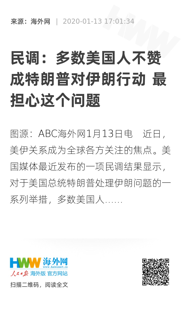 海外网1月13日电 近日,美伊关系成为全球各方关注的焦点。美国媒体最近发布的一项民调结果显示,对于美国总统特朗普处理伊朗问题的一系列举措,多数美国人表示不赞成,并对美国的安全问题再度产生焦虑。