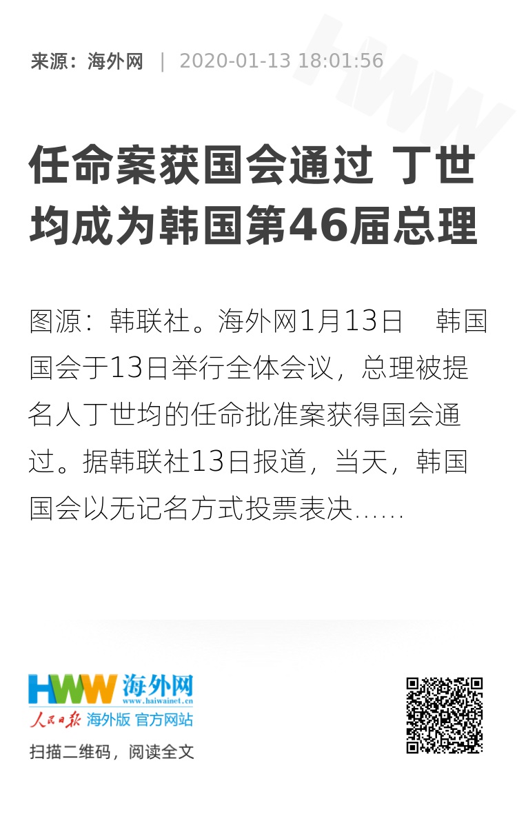 报道称,这是韩国总统文在寅2019年12月17日提名丁世均为新任总理后,时隔29天获国会放行。丁世均继李洛渊之后,成为本届政府第二任总理暨韩国第46届总理。而现任总理李洛渊将辞职,以备战国会议员选举。