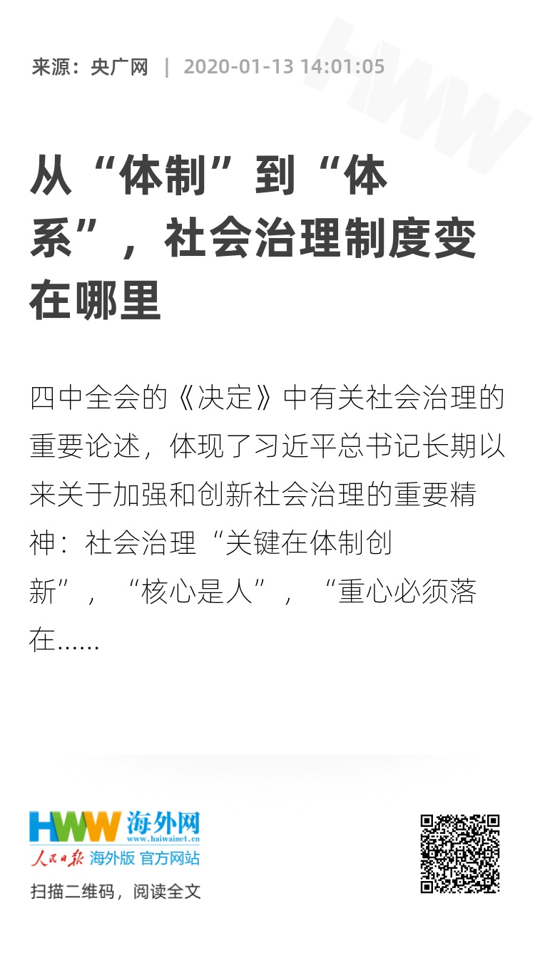 十九届四中全会,一是实现了从“社会治理体制”到“社会治理体系”的重要转变,体现了社会治理内涵的不断丰富,系统性、整体性和科学性不断增强。二是把“民主协商”和“科技支撑”放在社会治理体系中,使我们的社会治理体系更加完善。