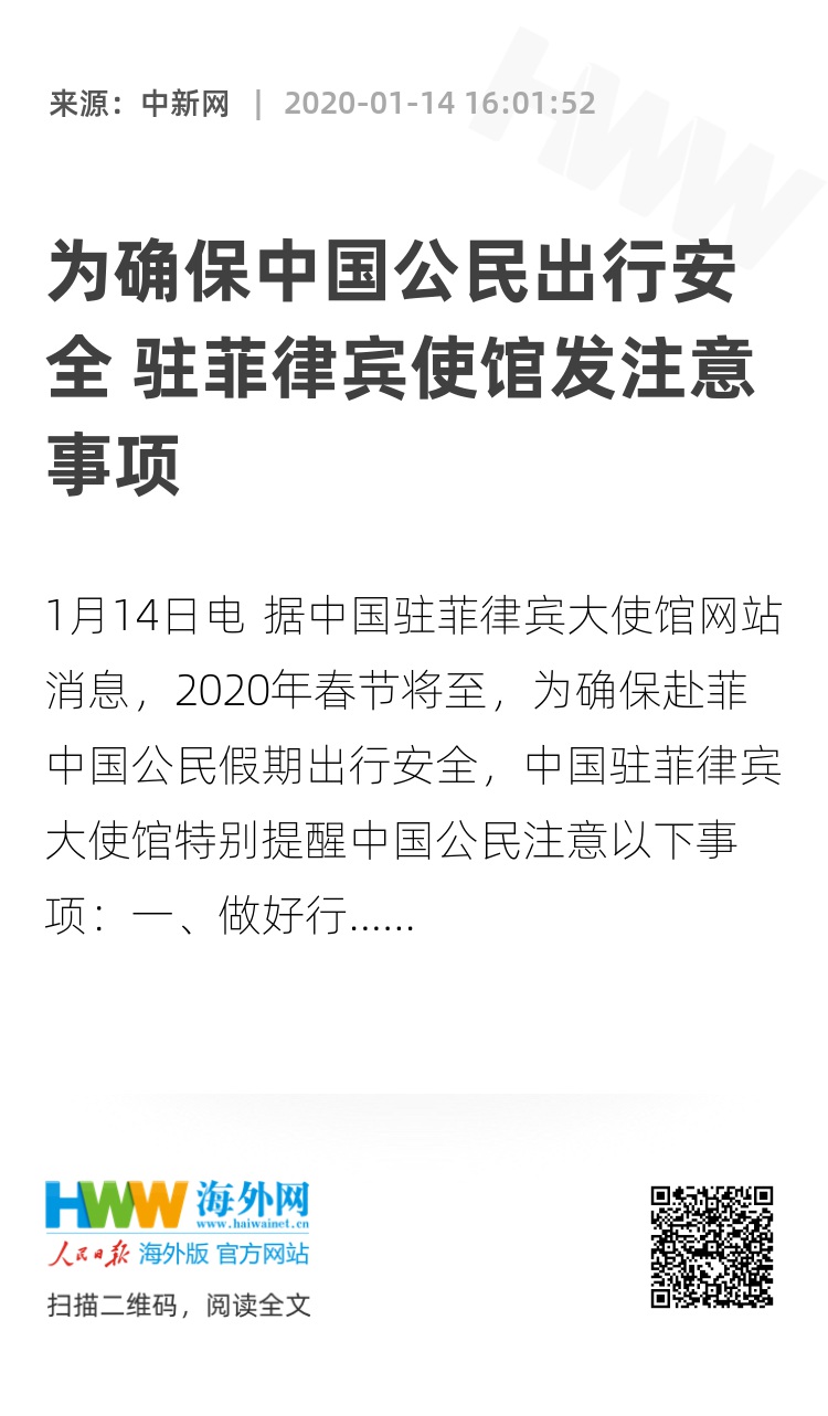 中新网1月14日电 据中国驻菲律宾大使馆网站消息,2020年春节将至,为确保赴菲中国公民假期出行安全,中国驻菲律宾大使馆特别提醒中国公民注意以下事项:
