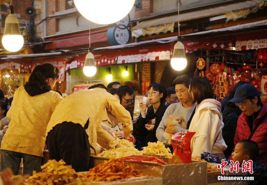春节临近,一年一度的台北迪化商圈年货大街吸引了众多市民前往游赏、采购,彩灯彩旗从街头挂到街尾,年味十足。 中新社记者 史元丰 摄