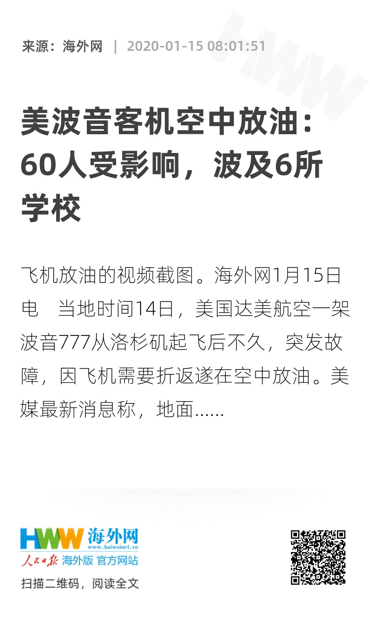 海外网1月15日电 当地时间14日,美国达美航空一架波音777从洛杉矶起飞后不久,突发故障,因飞机需要折返遂在空中放油。美媒最新消息称,地面已有60人受到影响,波及6所学校。