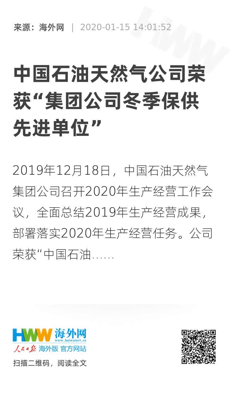 2019年12月18日,中国石油天然气集团公司召开2020年生产经营工作会议,全面总结2019年生产经营成果,部署落实2020年生产经营任务。公司荣获“中国石油天然气集团有限公司天然气冬季保供先进单位”荣誉称号。公司副总经理、安全总监张鹏参加会议并代表公司领奖。