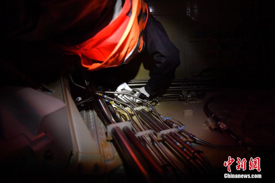 1月15日凌晨,“飞机医生”在进行液压管路维修检查。中新社记者 刘冉阳 摄
