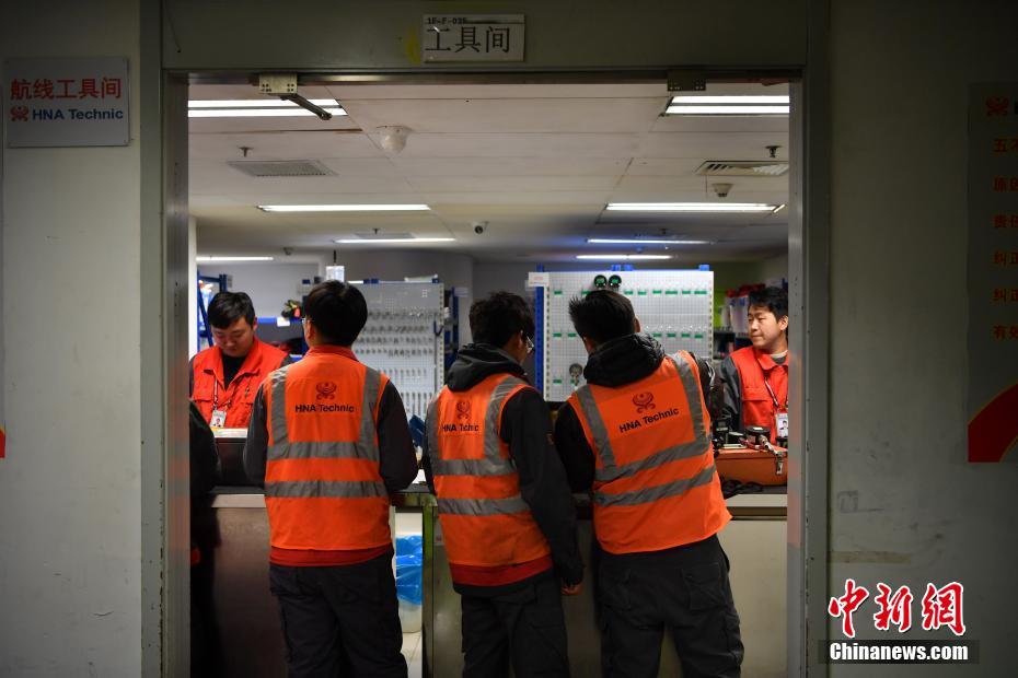 1月14日晚,一夜的航后检查工作即将开始,工程师在工具间进行工具准备。中新社记者 刘冉阳 摄