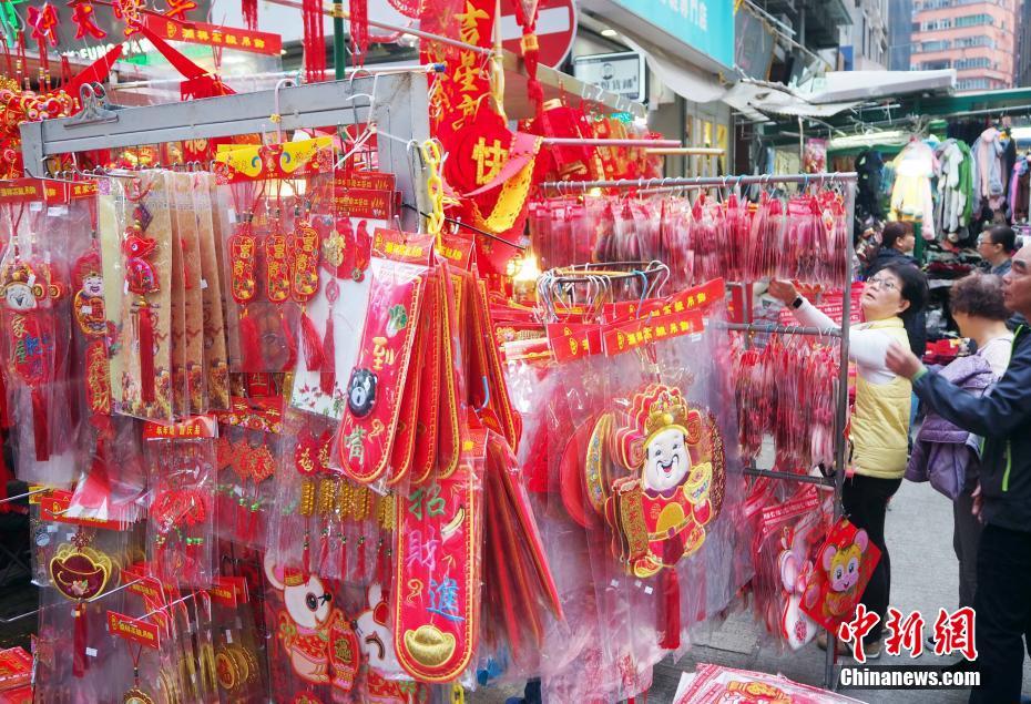 1月16日,香港湾仔太原街人群熙熙攘攘,这里街道两旁出售的新春传统装饰品琳琅满目,一些新春对联和贺年糖果糕点热销。 中新社记者 洪少葵 摄