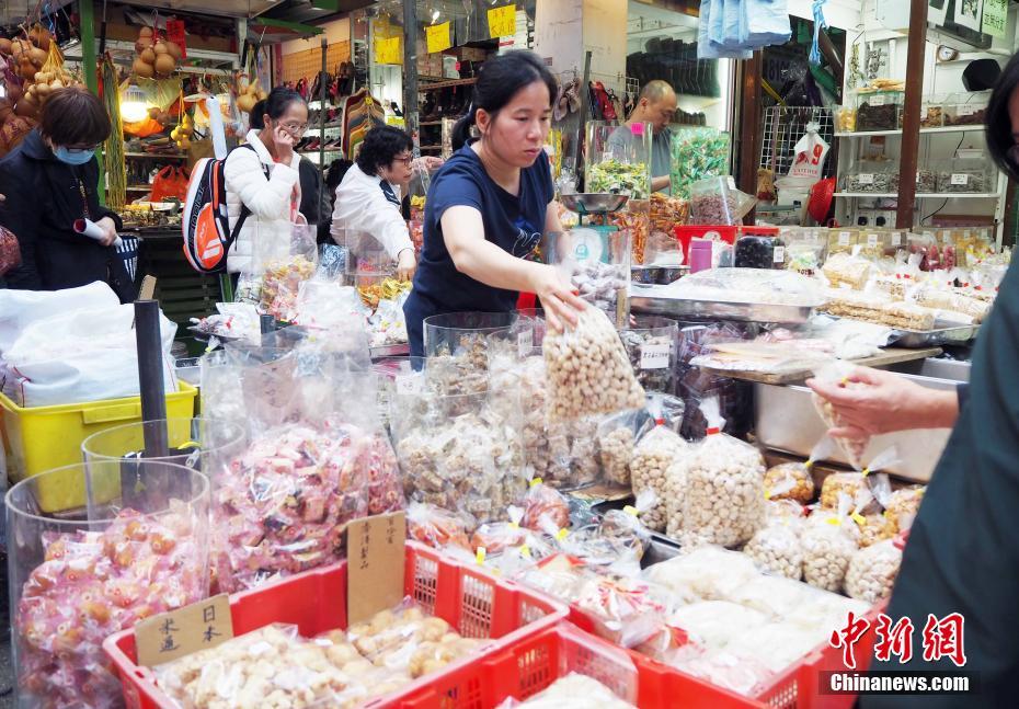 1月16日,香港市民在选购应节食品。年近岁晚,新春气氛暂浓。这条著名的湾仔太原街小商品街市,街道两旁出售的农历年传统装饰品琳琅满目,一些新春对联和贺年糖果糕点热销。 中新社记者 洪少葵 摄