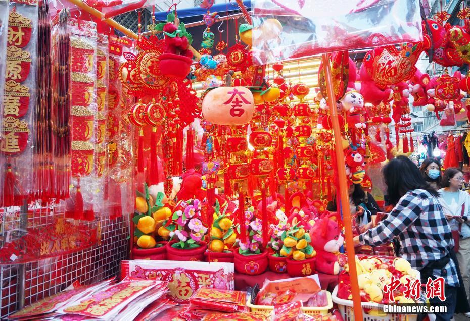 1月16日,香港湾仔太原街人群熙熙攘攘,这里街道两旁出售的新春传统装饰品琳琅满目,一些对联和贺年糖果糕点热销。 中新社记者 洪少葵 摄
