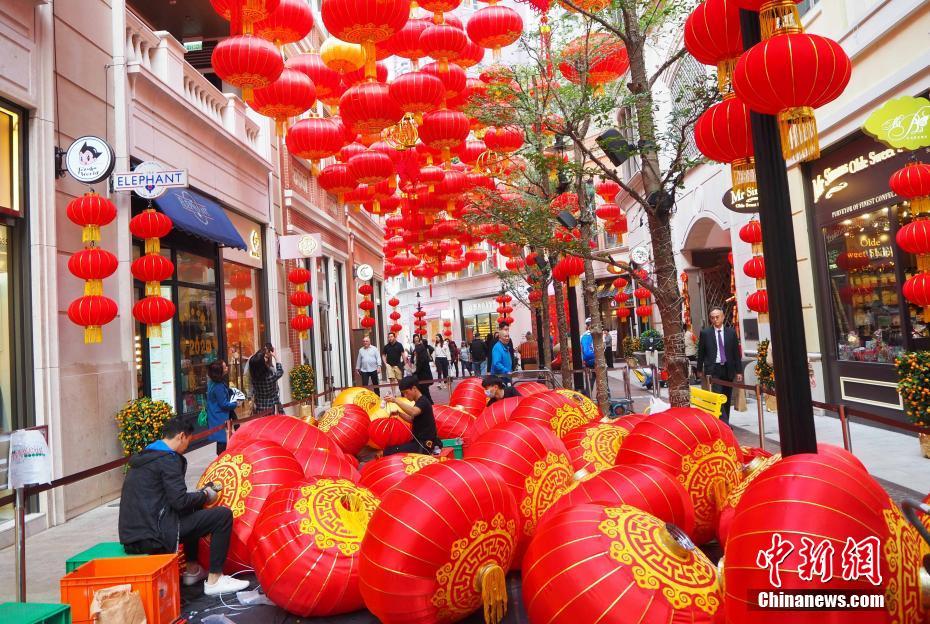 1月16日,工人在香港湾仔利东街挂大红灯笼,准备迎接新春佳节。距离农历新年日子越来越近,香港各区新春装饰陆续登场,有传统贺年彩饰也有西洋潮流场景。 中新社记者 洪少葵 摄