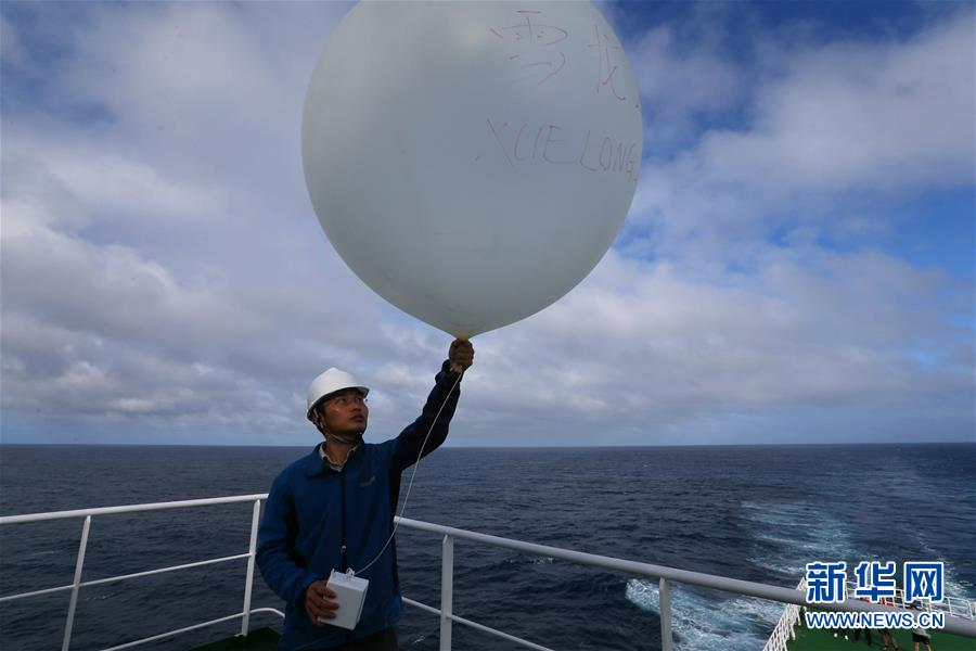 科考队员在“雪龙2”号上释放探空气球(1月15日摄)。新华社记者 刘诗平 摄