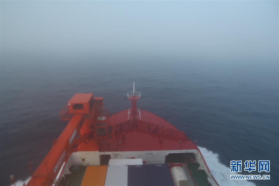 “雪龙2”号在雾中穿越西风带(1月15日摄)。当地时间15日20时(北京时间16日2时),“雪龙2”号极地科考破冰船经过东经23度11分、南纬40度的印度洋海域,顺利穿越“咆哮西风带”,驶向南非开普敦。 新华社记者 刘诗平 摄