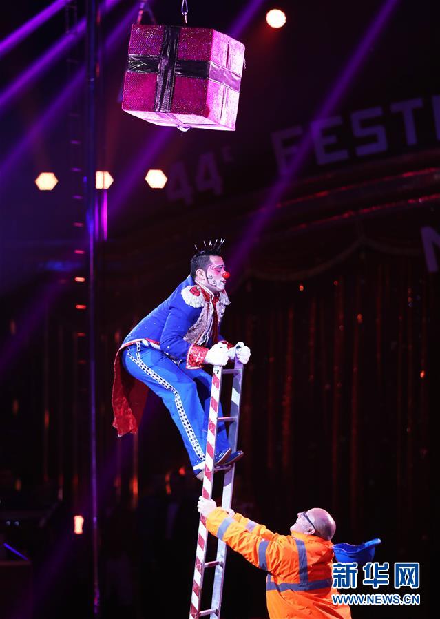 1月17日,在摩纳哥蒙特卡洛,小丑演员亨利·阿亚拉(上)在第44届蒙特卡洛国际马戏节上表演。 第44届蒙特卡洛国际马戏节16日在摩纳哥开幕,来自中国、瑞士、俄罗斯等16个国家和地区的演员们角逐马戏节最高奖项“金小丑”奖。 新华社记者 高静 摄
