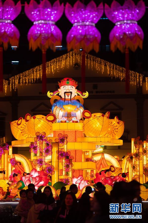 1月18日在澳门议事亭前地拍摄的春节灯饰。 为迎接新春佳节,澳门市政署以“金鼠迎春贺新禧”为主题,在各街区78个地点布置传统花灯和特色金鼠造型灯饰,让市民和游客感受喜庆祥和的年味,开启新年新气象。 新华社记者 张金加 摄